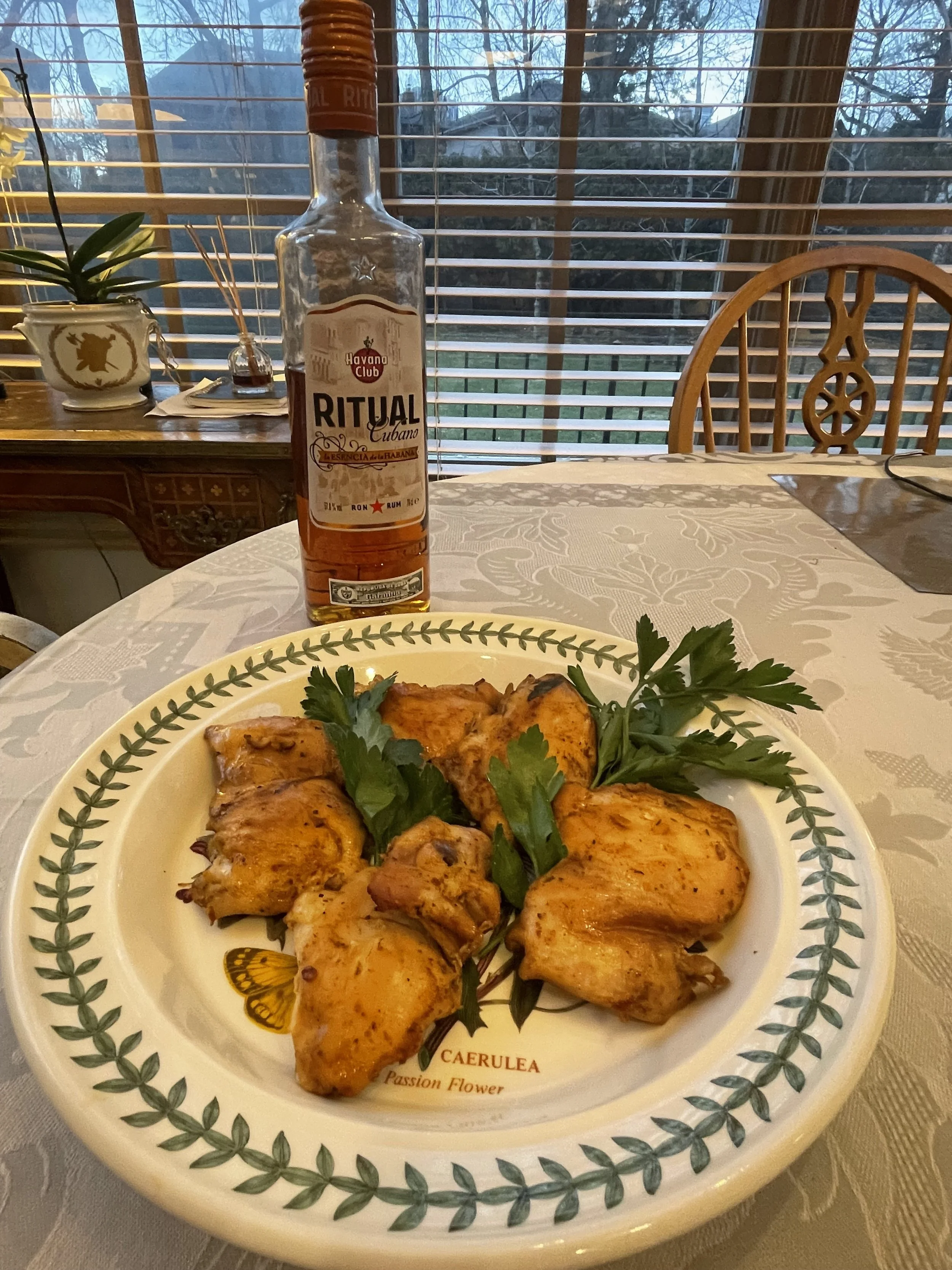 Come back to the oven in 25 minutes, check on the dish. It should be ready - you can always put a thermometer to check the temperature. I like the old fashioned way - with a fork. Serve the pollo a la cubana on a beautiful serving dish (Portmerion is my go to choice) and garnish it with lemon and parsley. Oh, and folks - make sure you are using an aged, dark Cuban rum for this recipe.
